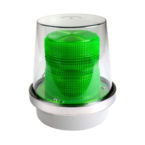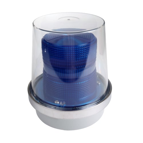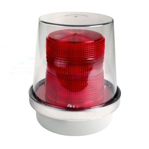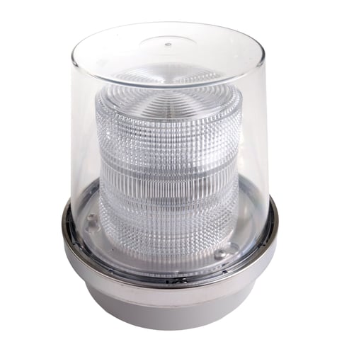 Halogen light source |Flash rate 65 fpm |Shatter-resistant double fresnel polycarbonate lens |Protective polycarbonate dome |Cast metal base |Suitable for use in indoor and outdoor applications |For outdoor use, lens should face up |1/2" NPT conduit or surface mounting |Designed for 4" octagonal box mounting |Option for panel, conduit or wall mounting |Operating temperature range: -31°F to 150°F (-35°C to 66°C)